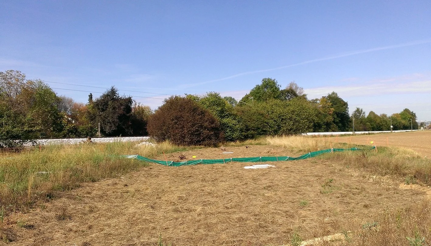 Die zuvor brachliegenden Wiesen- und Gehölzflächen entlang der Bahnlinie werden im Zuge einer Ausgleichsmaßnahme zu Eidechsenhabitaten ausgebildet.